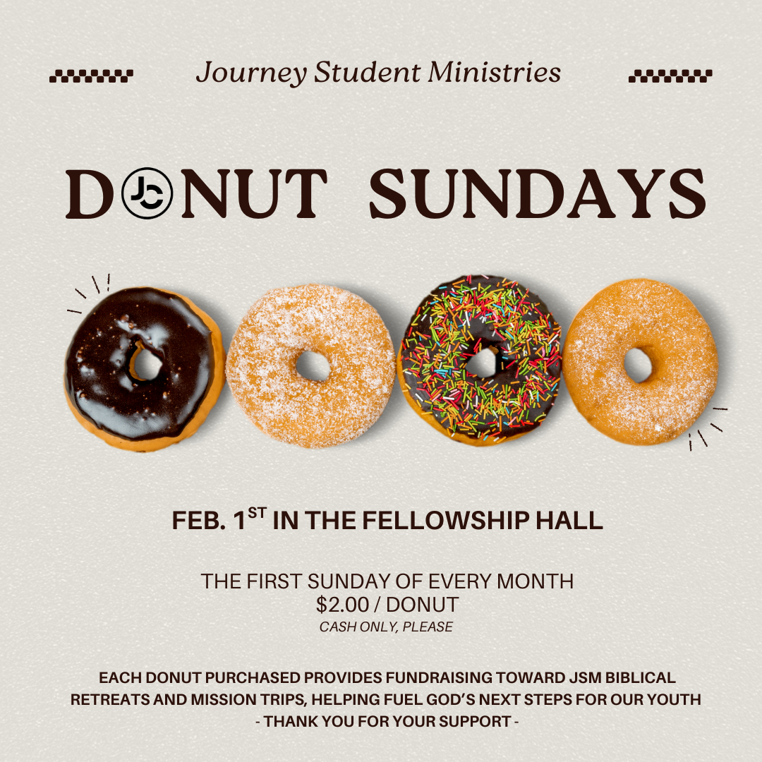 Journey Student Ministries is launching Donut Sundays in the Fellowship Hall beginning January 11th! 🍩
