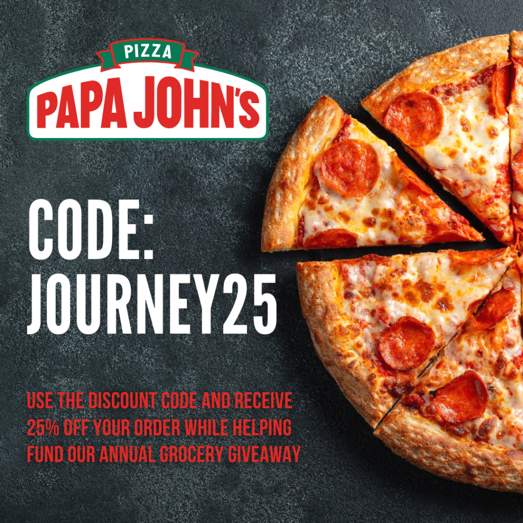 When you order through Papa John’s, use code JOURNEY25 to receive 25% off your order. AND help fund Journey Church’s annual grocery giveaway!